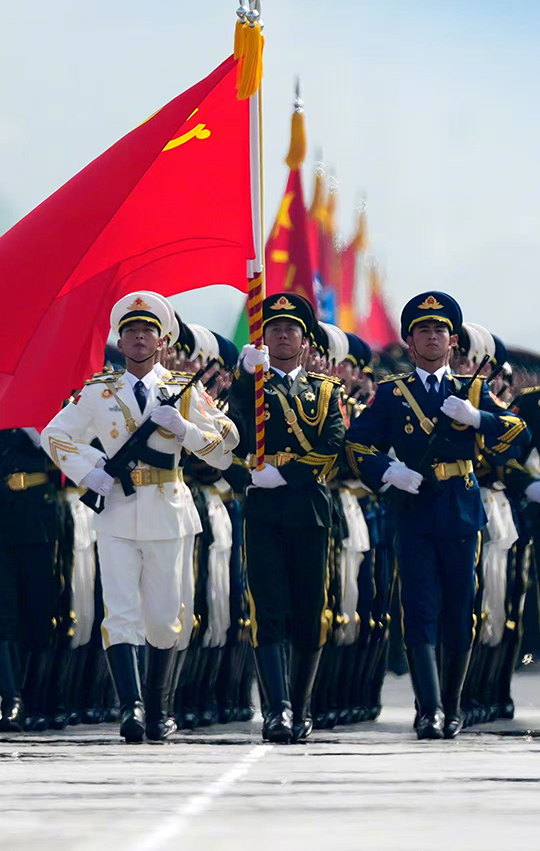 Vào lúc 10 giờ sáng, khi cuộc duyệt binh bắt đầu, bài quốc ca trang trọng được vang lên và tất cả những người tham gia đều tự động đứng dậy để tỏ lòng thành kính. Những bước đi gọn gàng của đội hình, trang bị tinh vi của các dàn vũ khí và những tiếng vang trên không hùng vĩ khiến mọi người vô cùng sốc, cho thấy sức mạnh quốc phòng của Trung Quốc đang được cải thiện. Màn trưng bày 80 lá cờ danh dự của các đơn vị anh hùng chiến tranh chống Nhật cũng khiến người ta nhận ra chiến thắng đó khó khăn đến nhường nào.