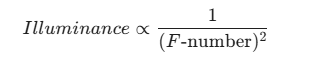 Khi mua hoặc sản xuất thiết bị an ninh, bạn có thể dễ dàng nhìn vào ống kính F2.0 và ống kính F1.0 và nghĩ,“Chỉ chênh lệch 1,0 thôi phải không?”Sai. Trong thế giới quang học, số f không có tỷ lệ tuyến tính. Số f (hoặc tỷ lệ tiêu cự) là tỷ lệ giữa tiêu cự của thấu kính với đường kính của đồng tử vào. Công thức tính công suất thu ánh sáng (độ sáng) của ống kính cho biết lượng ánh sáng chạm vào cảm biến tỷ lệ nghịch với bình phương của số f: